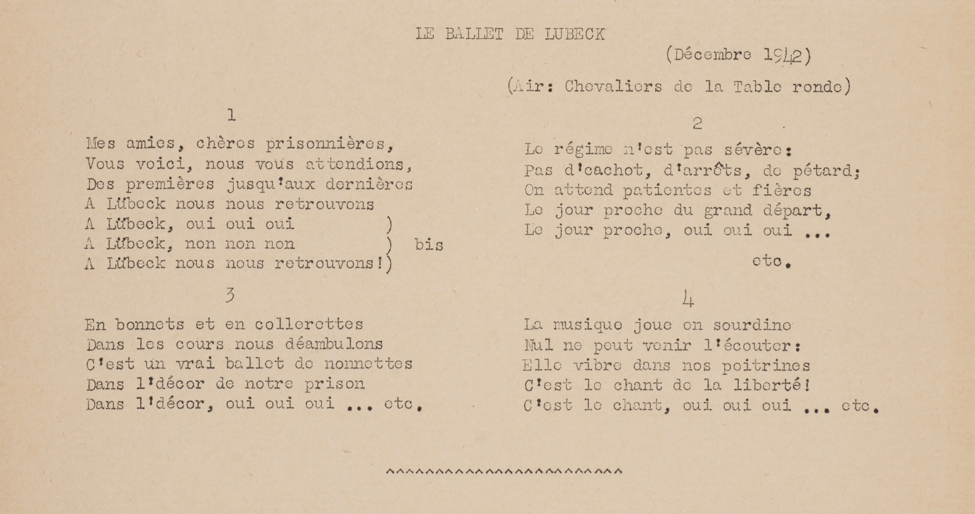 Si Baratte et Oddon ne peuvent s’être croisées ni en prison, ni à Ravensbrück (leurs dates de déportation et de transfert d’un lieu de détention à l’autre ne coïncidant pas), le fait qu’elles aient toutes les deux inclus Chevaliers de la Table ronde dans leurs recueils respectifs témoigne de la très vaste circulation de cette « vieille chanson bachique » à l’époque de la Seconde Guerre mondiale. Dans la version détournée notée par Oddon sous le titre Le ballet de Lübeck, la mélodie connue sert de support à un air d’espoir de quatre strophes seulement (contre six dans la partition originale reproduite ici, et jusqu’à huit ou neuf dans d’autres versions de Chevaliers de la Table ronde). Le nouveau texte exalte non seulement le régime prétendument peu sévère de la prison de Lübeck, mais surtout le « grand départ » qu’attendent les prisonnières, tout en faisant « vibre[r] dans [leurs] poitrines » « le chant » de cette « liberté » qu’elles souhaitent ardemment retrouver.