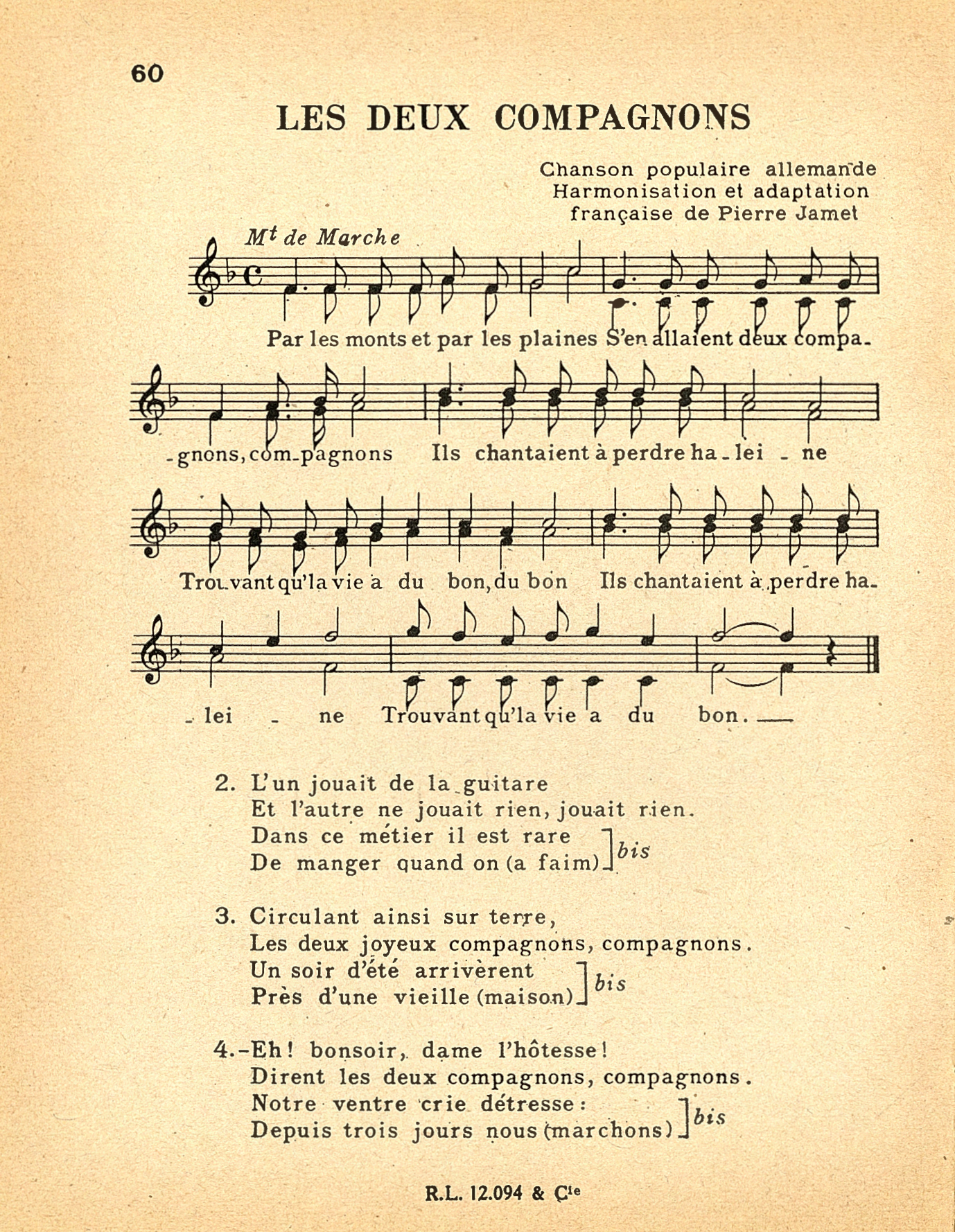 « Les deux compagnons », partition pour deux voix, dans La clé des chants, 100 chansons recueillies et harmonisées par Marie-Rose Clouzot et Pierre Jamet avec le concours d’Albert Jaillet, Paris, Éditions Salabert, 1942, p. 60-61.