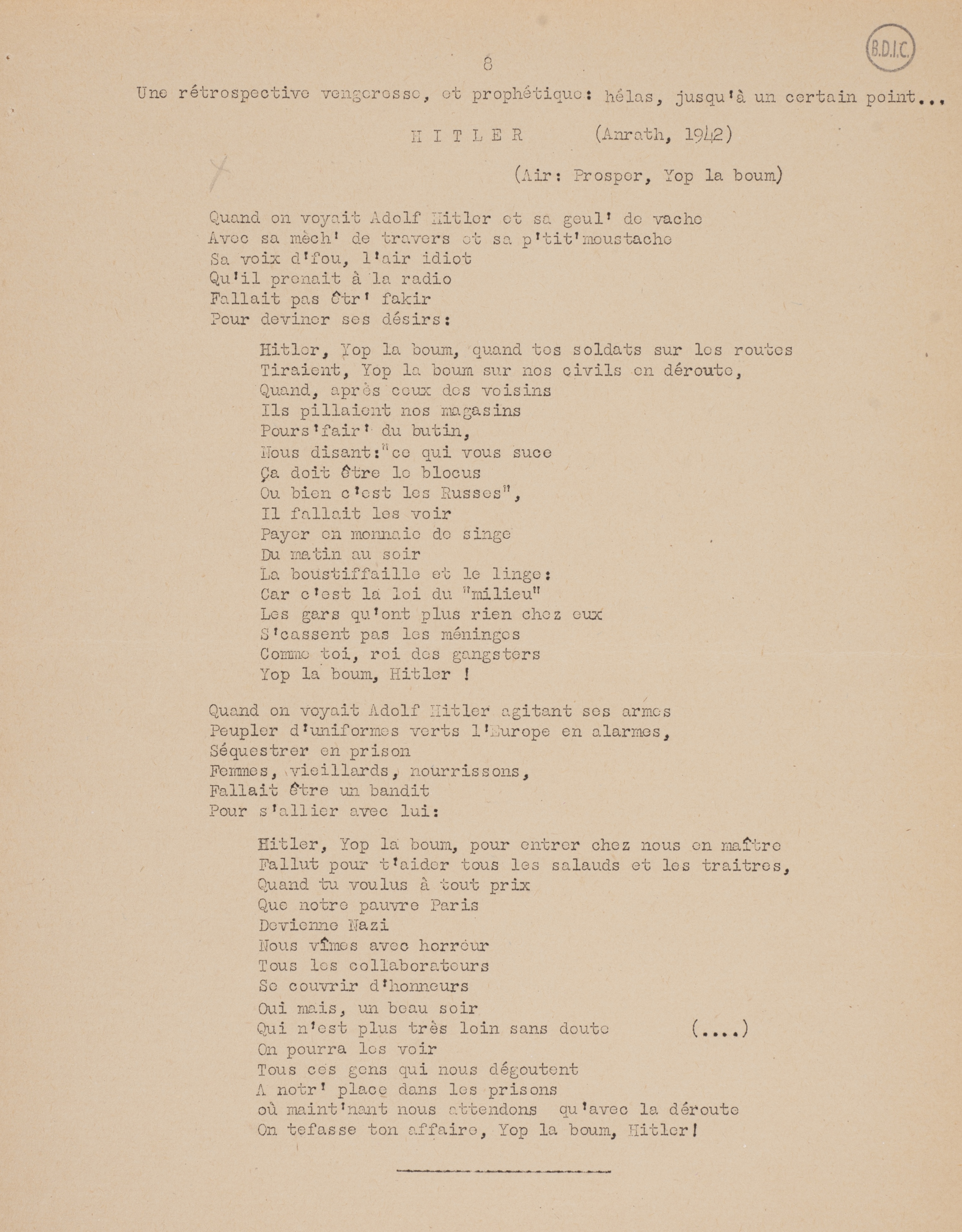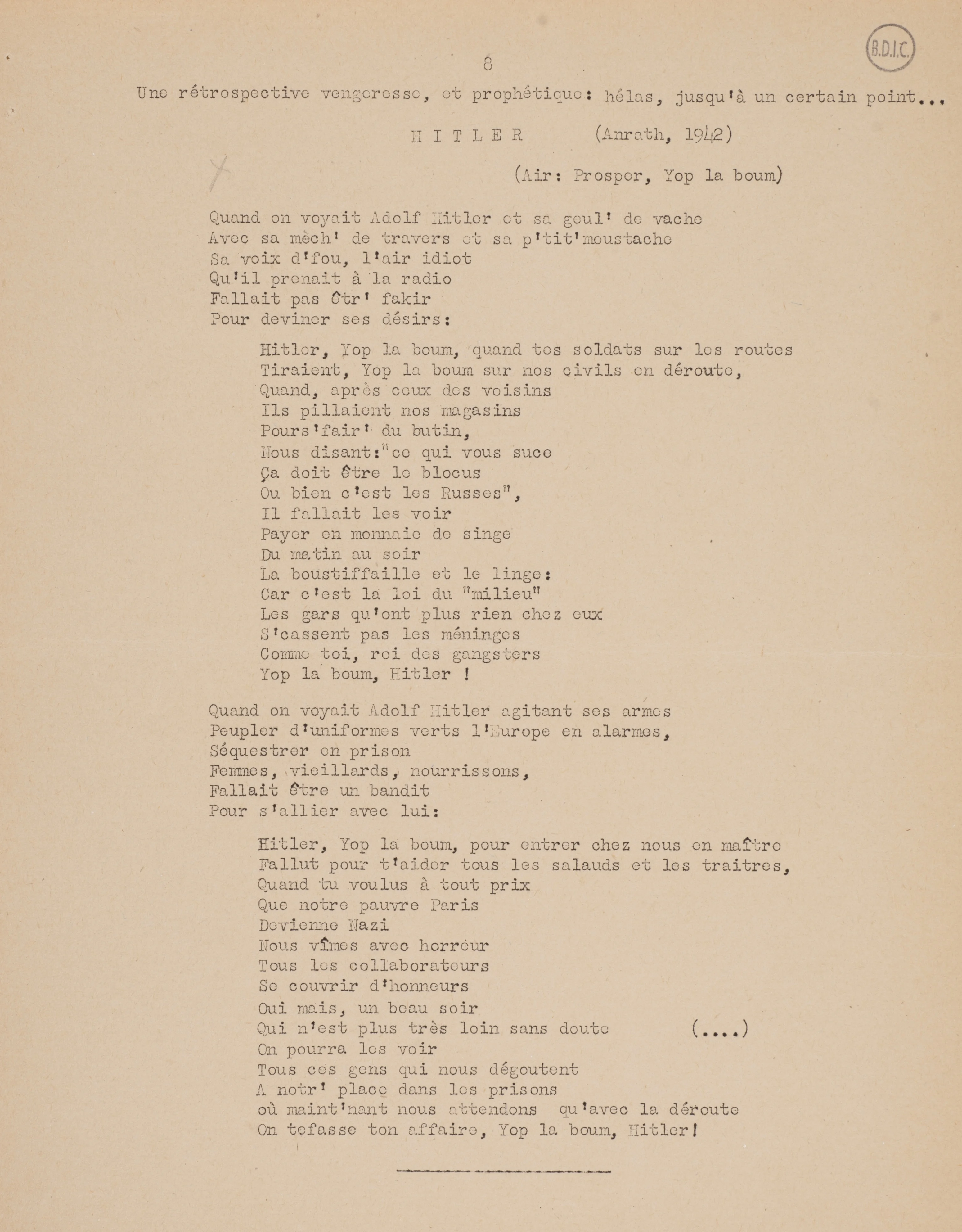 La version détournée par Oddon et ses camarades s’appuie sur un premier avatar de cette chanson : Hitler, Yop la boum, simple refrain écrit par l’auteur et dessinateur français Maurice Van Moppès parti rejoindre Charles de Gaulle à Londres au début de la guerre et intervenant dans l’émission de la BBC Les Français parlent aux Français. Van Moppès exploite la proximité phonétique entre « Prosper » et « Hitler » pour produire un extrait musical hautement satirique sur le dictateur nazi. Le refrain (quatre vers seulement) est diffusé sur les ondes de la BBC le 17 décembre 1941 et la partition paraît dans un petit recueil de Chansons de la BBC parachuté en France par la Royal Air Force vers 1943, puis formellement publiée en 1944 (« Hitler, et Yop la boum/ V’là ton prestig’ qui s’entame / Hitler, et Yop la boum / Tu vas t’fout’ sur l’macadam! »). Les résistantes qui entouraient Yvonne Oddon ont donc pu avoir connaissance de ce refrain détourné avant leur arrestation.