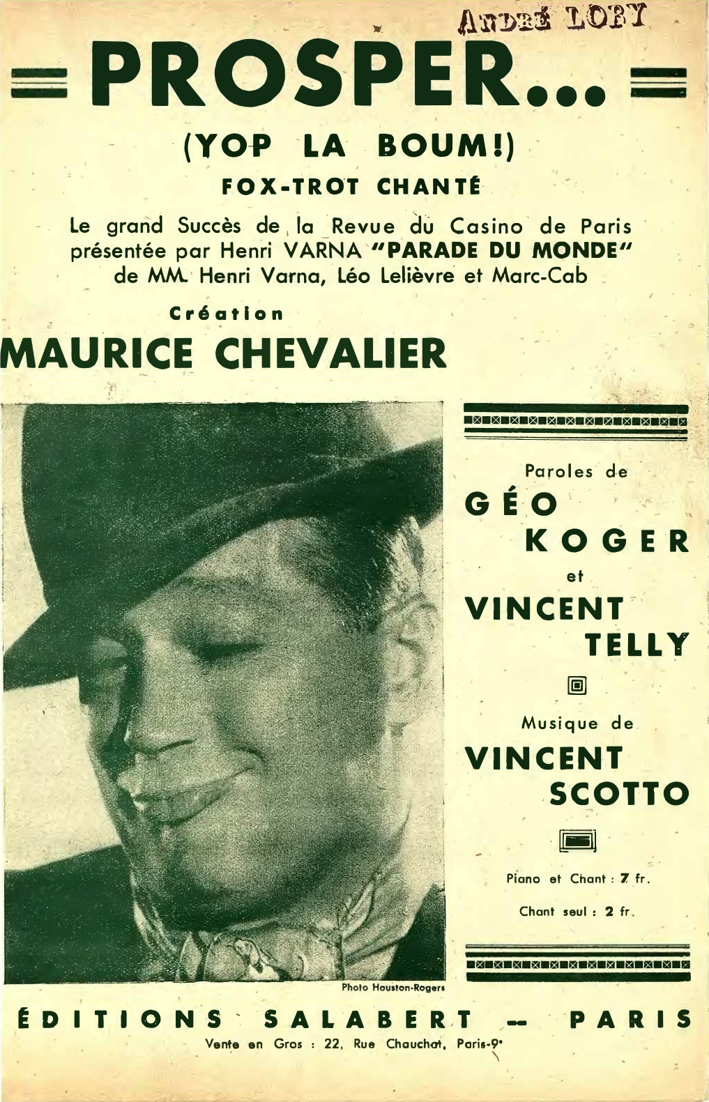 Géo Koger et Vincent Telly (paroles), Vincent Scotto (musique), Prosper (Yop La Boum), Maurice Chevalier (chant), orchestre M. Jo Bouillon, 1 disque 78 tours, Gramophone, K-7588, 1935.