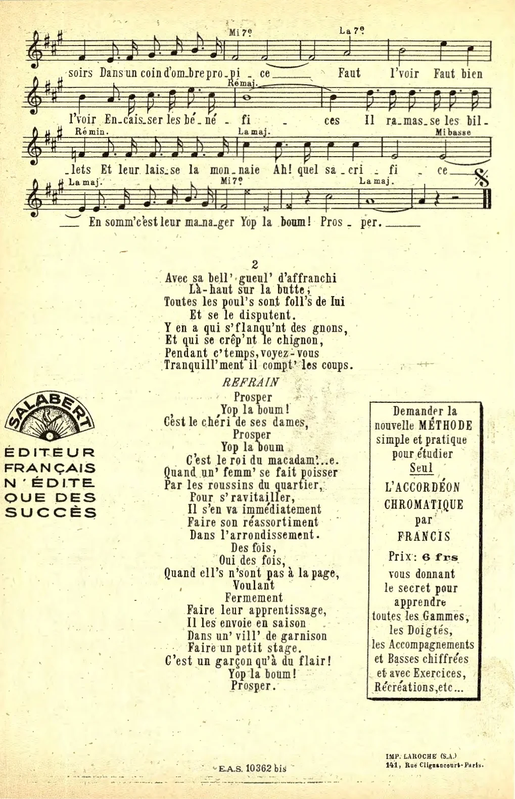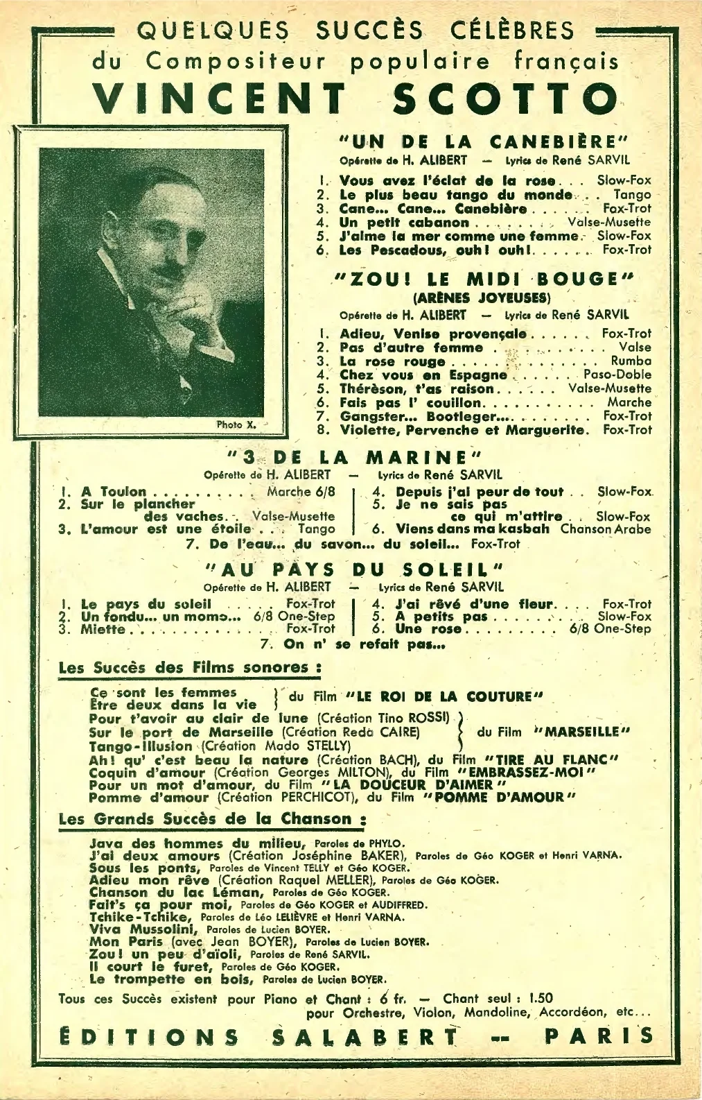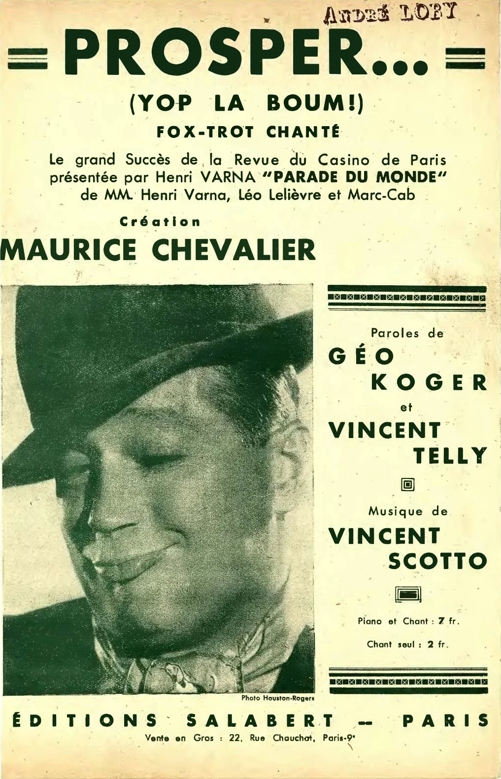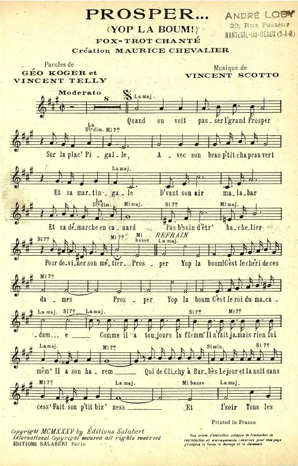 Géo Koger et Vincent Telly (paroles), Vincent Scotto (musique), Prosper... (Yop La Boum!), fox-trot, partition pour chant seul, Paris, Salabert, E.A.S. 10362bis, 1935.
