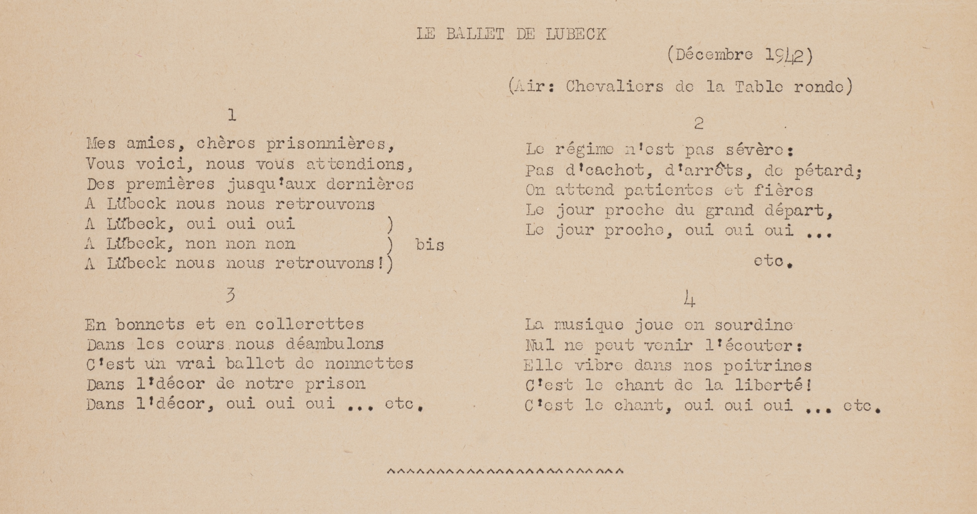 Si Baratte et Oddon ne peuvent s’être croisées ni en prison, ni à Ravensbrück (leurs dates de déportation et de transfert d’un lieu de détention à l’autre ne coïncidant pas), le fait qu’elles aient toutes les deux inclus Chevaliers de la Table ronde dans leurs recueils respectifs témoigne de la très vaste circulation de cette « vieille chanson bachique » à l’époque de la Seconde Guerre mondiale. Dans la version détournée notée par Oddon sous le titre Le ballet de Lübeck, la mélodie connue sert de support à un air d’espoir de quatre strophes seulement (contre six dans la partition originale reproduite ici, et jusqu’à huit ou neuf dans d’autres versions de Chevaliers de la Table ronde). Le nouveau texte exalte non seulement le régime prétendument peu sévère de la prison de Lübeck, mais surtout le « grand départ » qu’attendent les prisonnières, tout en faisant « vibre[r] dans [leurs] poitrines » « le chant » de cette « liberté » qu’elles souhaitent ardemment retrouver.