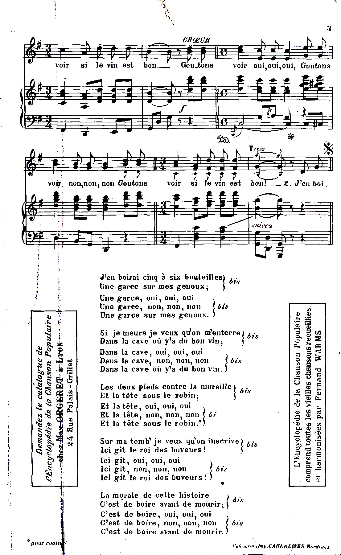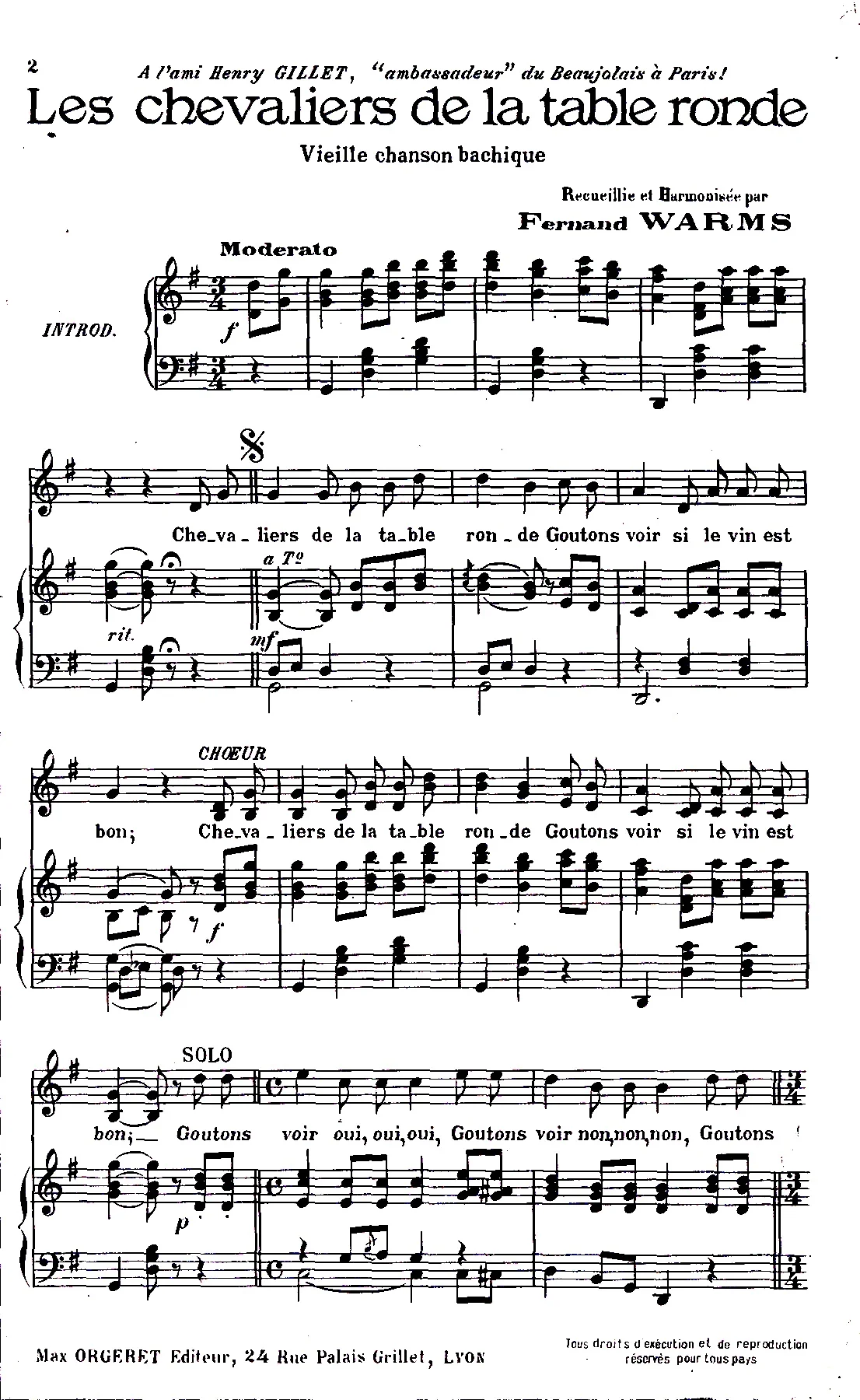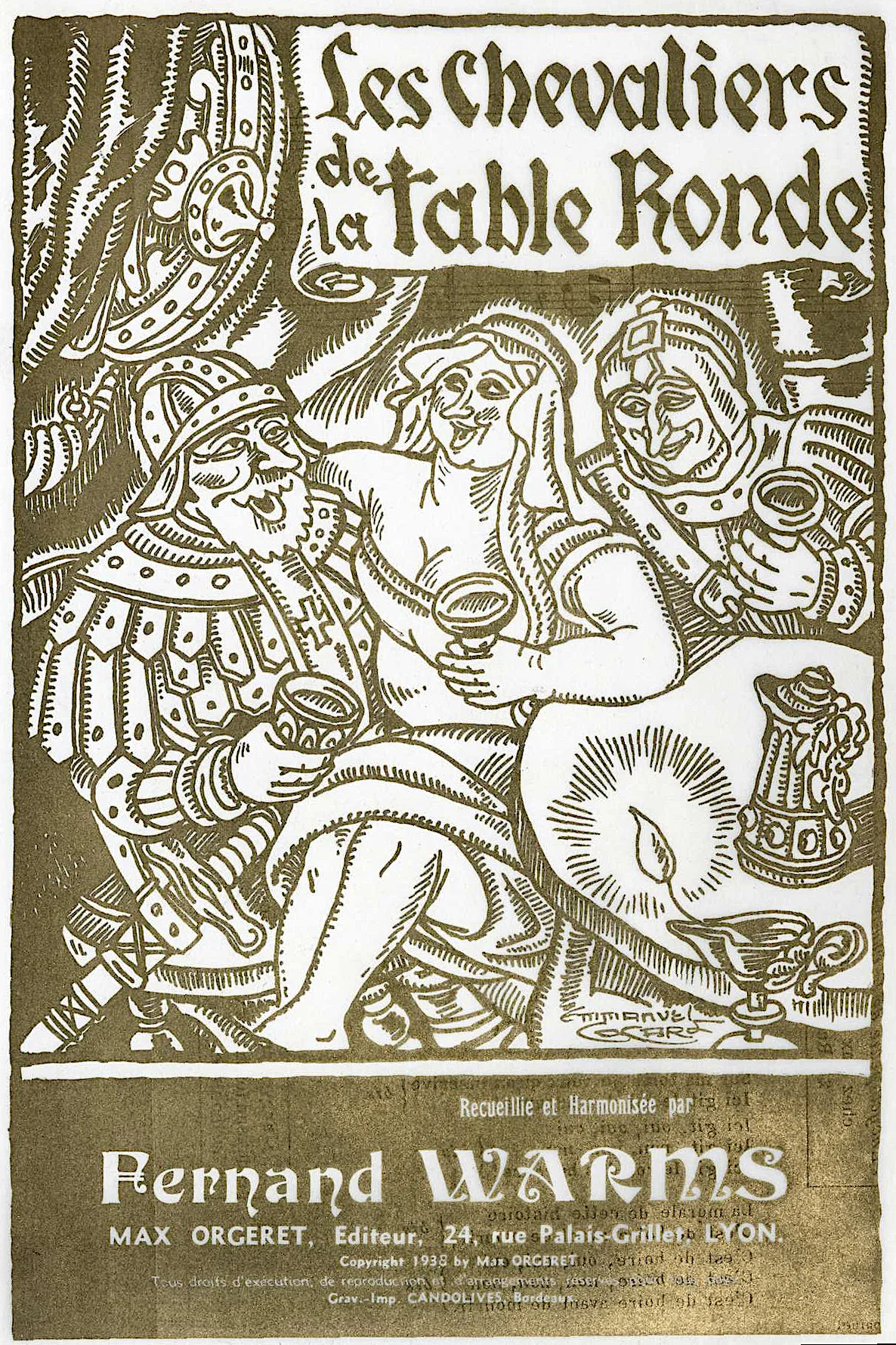 Chevaliers de la table ronde : Vieille chanson bachique, recueillie et harmonisée par Fernand Warms, partition pour chant et piano, Lyon, Max Orgeret, 1938.