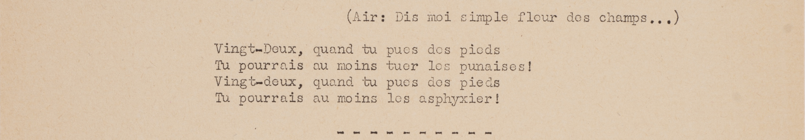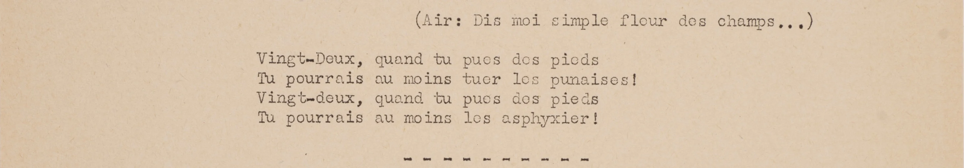 C’est précisément le texte cité dans cet entrefilet qu’Oddon reprend et détourne avec ses camarades de prison. L’humour prosaïque et le ton familier de la chanson permettent d’évoquer à la fois les rondes des gardiens (les « 22 » ou « Vingt-e-deux », à prononcer sur trois syllabes pour respecter la prosodie de la chanson d’origine) et l’odeur désagréable de leurs pieds, laquelle ne parvient même pas à tuer les punaises qui parasitent les cellules des prisonnières.