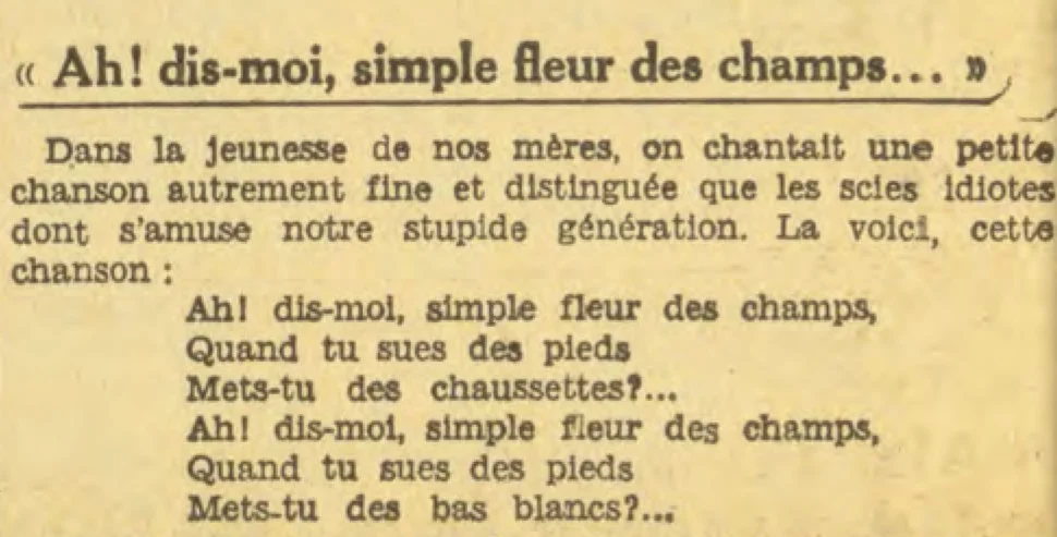 Dans l’hebdomadaire satirique belge Pourquoi pas? du 16 mars 1934, la chanson est citée comme appartenant à « la jeunesse de nos mères » et sert d’amorce pour aborder – à travers une opposition comique avec la transpiration des pieds – l’image ressassée de la fleur comme symbole de pureté et d’élégance féminines.